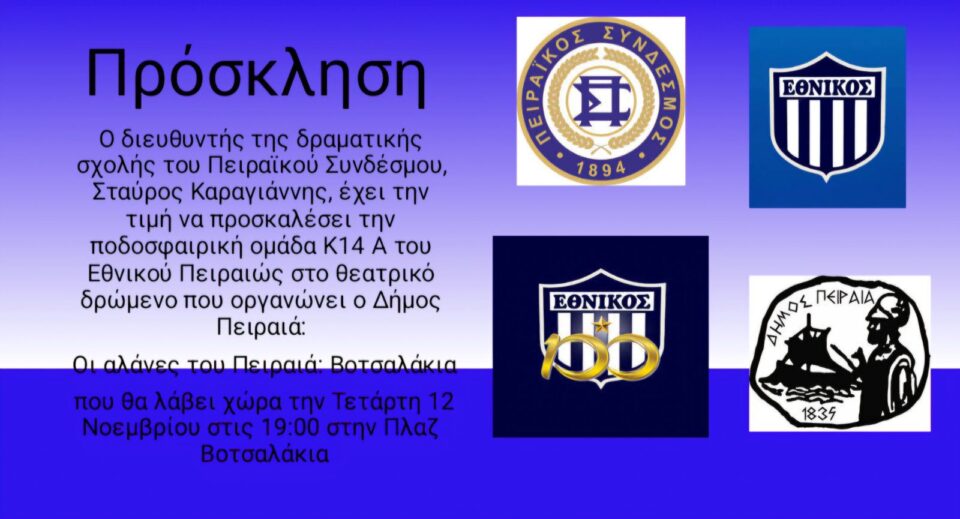 Στα πλαίσια του δρώμενου του Δήμου Πειραιά «Οι Αλάνες του Πειραιά», η ομάδα Κ14 Α’ της Ακαδημίας μας προσκλήθηκε από τον Διευθυντή της Δραματικής Σχολής του Πειραϊκού Συνδέσμου, κ. Σταύρο Καράγιαννη, να συμμετάσχει στη θεατρική δράση που θα πραγματοποιηθεί την Τετάρτη 12 Νοεμβρίου, και ώρα 19:00, στα Βοτσαλάκια.